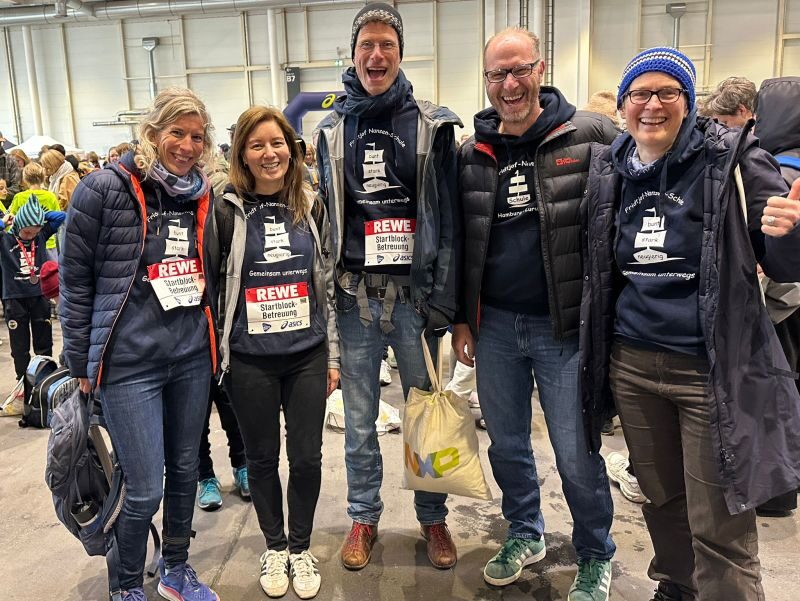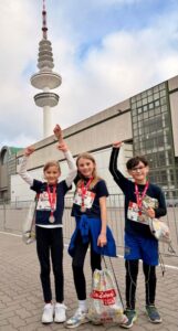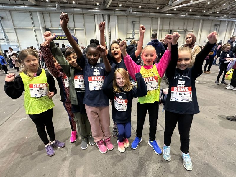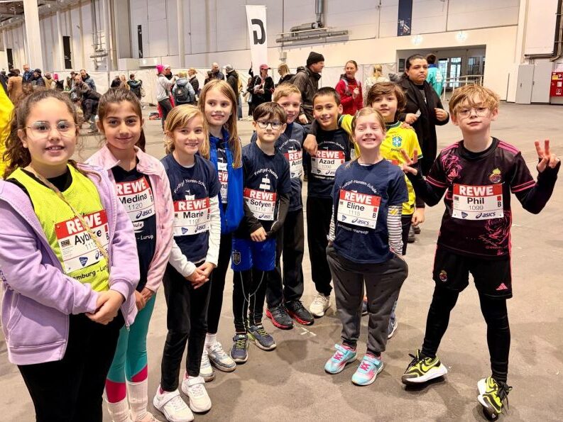 In der Messehalle angekommen, versammelten sich alle Kinder mit ihren Eltern und Geschwistern am vereinbarten Treffpunkt. Die Sportlehrkräfte Torsten Schöwing, Janine Beck, Daniela Helmboldt, Ulrike Ritter und Marco Gerritsen empfingen die aufgeregten Kinder. Die letzten Startschilder wurden befestigt, noch ein Schluck getrunken und die Schnürbänder festgezogen, bevor die 6 – 11-jährigen Läufer in Begleitung ihrer Lehrer zum Startpunkt gingen. Nach dem offiziellen Startschuss für insgesamt 2.000 Kinder in diesem Lauf gab es kein Halten mehr. Alle rannten motiviert und freudig los und trotzten dem eisigen Wind, der durch die Hamburger Straßen rund um den Fernsehturm fegte. Angefeuert wurden die laufenden Kinder von vielen Eltern und anderen Menschen, die am Straßenrand standen und klatschten.