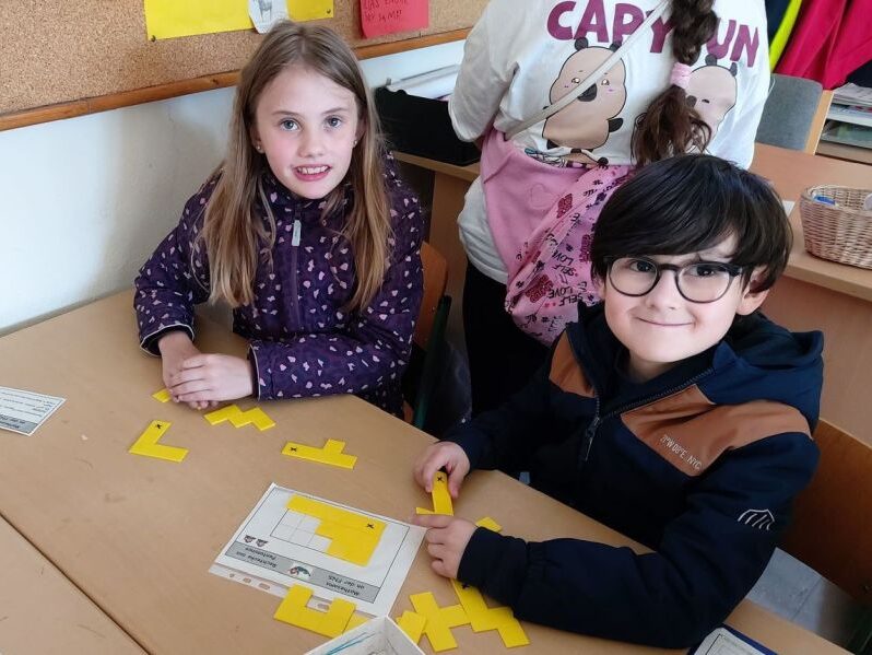 Zahlreiche Eltern und ältere Geschwister hatten sich wieder zum Helfen bereit erklärt. So saß an jedem Tisch eine Mutter oder ein Vater und erklärte freundlich die Aufgabe, die es zu lösen galt. Helfen war nicht erlaubt, aber Tipps geben schon und vor allem die Kinder zu motivieren, was viele Eltern liebevoll taten.