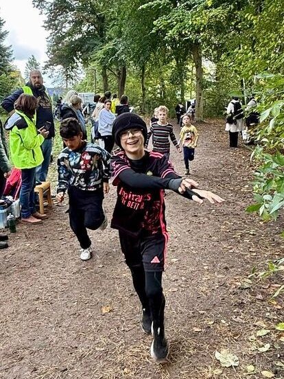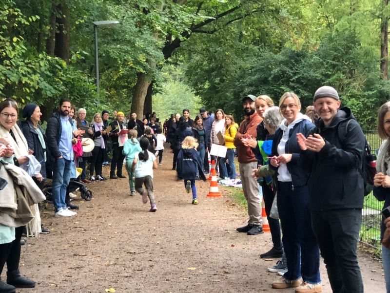 Am Mittwoch versammelten sich nicht nur alle Schüler und Schülerinnen am Start, sondern auch viele Eltern und Großeltern, die die Kinder kräftig anfeuerten. Mit Rasseln und Zurufen, aber auch mit Trommelschlägen motivierten sie die laufenden Jungen und Mädchen. Die gute Stimmung und der Jubel der Zuschauenden ließ so manches Kind über sich hinauswachsen. Die Vorschulkinder liefen die Runde um den Ententeich, die Erst- bis Viertklässler aber auch die große Runde von ca. 600 m Länge. Die meisten Läufer*innen schafften vier bis fünf Runden, es gab aber auch die ganz Schnellen mit neun oder zehn Runden. Am wichtigsten war aber nicht die Anzahl der gelaufenen Runden, sondern der Spaß am Sponsorenlauf und das schöne Gefühl, gemeinsam viel Geld für ein tolles Projekt gesammelt zu haben.